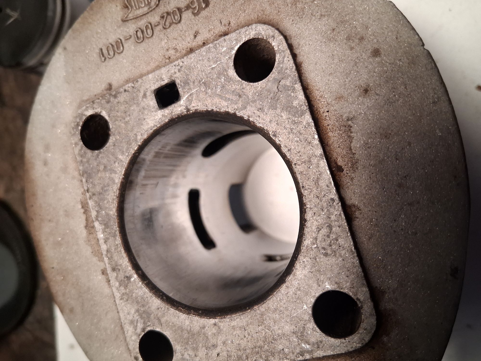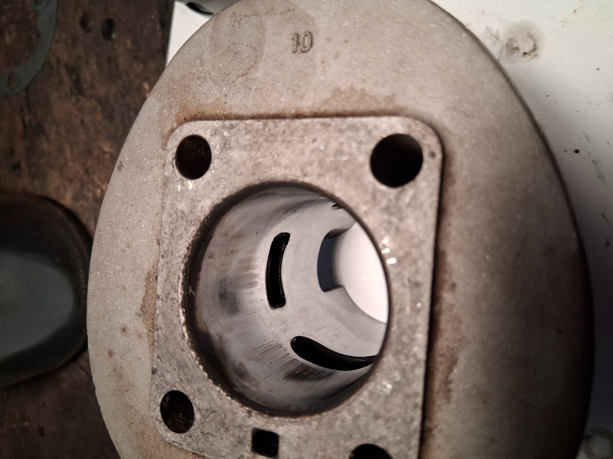 Der Zylinder hat erhebliche Trag- bzw Abnutzungsspuren im oberen Bereich. Hier hat der Kolben schon erhebliche Spuren hinterlassen. Vermutlich ist der Motor schon mehrfach haarscharf am Überhitzungstot vorbeigeschrammt.