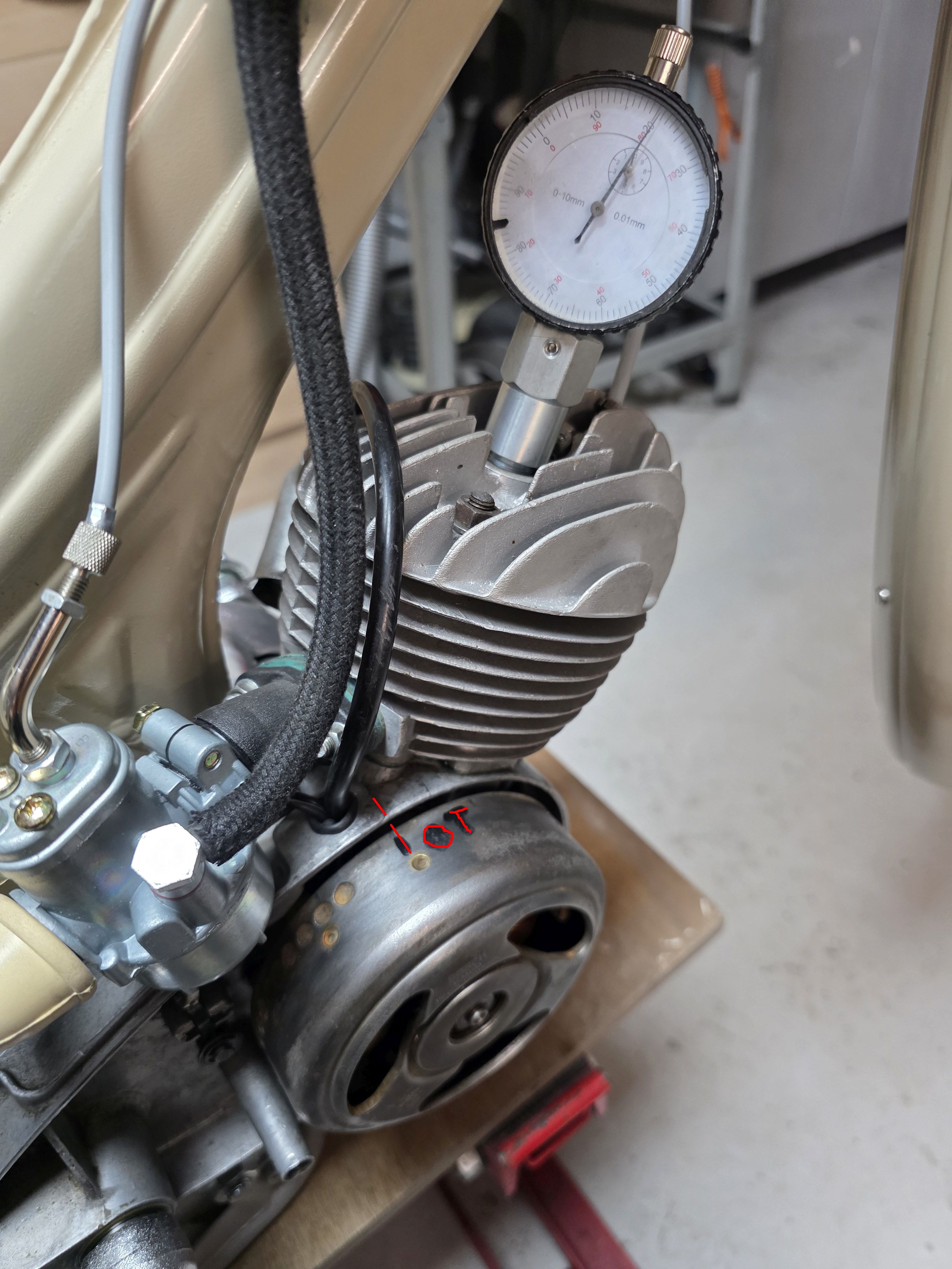 Oder die herkömmliche Methode mit dem einstellen vom OT durch verdrehen vom Polrad und dem anschliesenden festdrehen der Schrauben von der Grundplatte hinter den Streben des Polrades.Wo man immer so ums Eck greifen muss und den Langlöchern von der Grundplatte am Endanschlag ist!